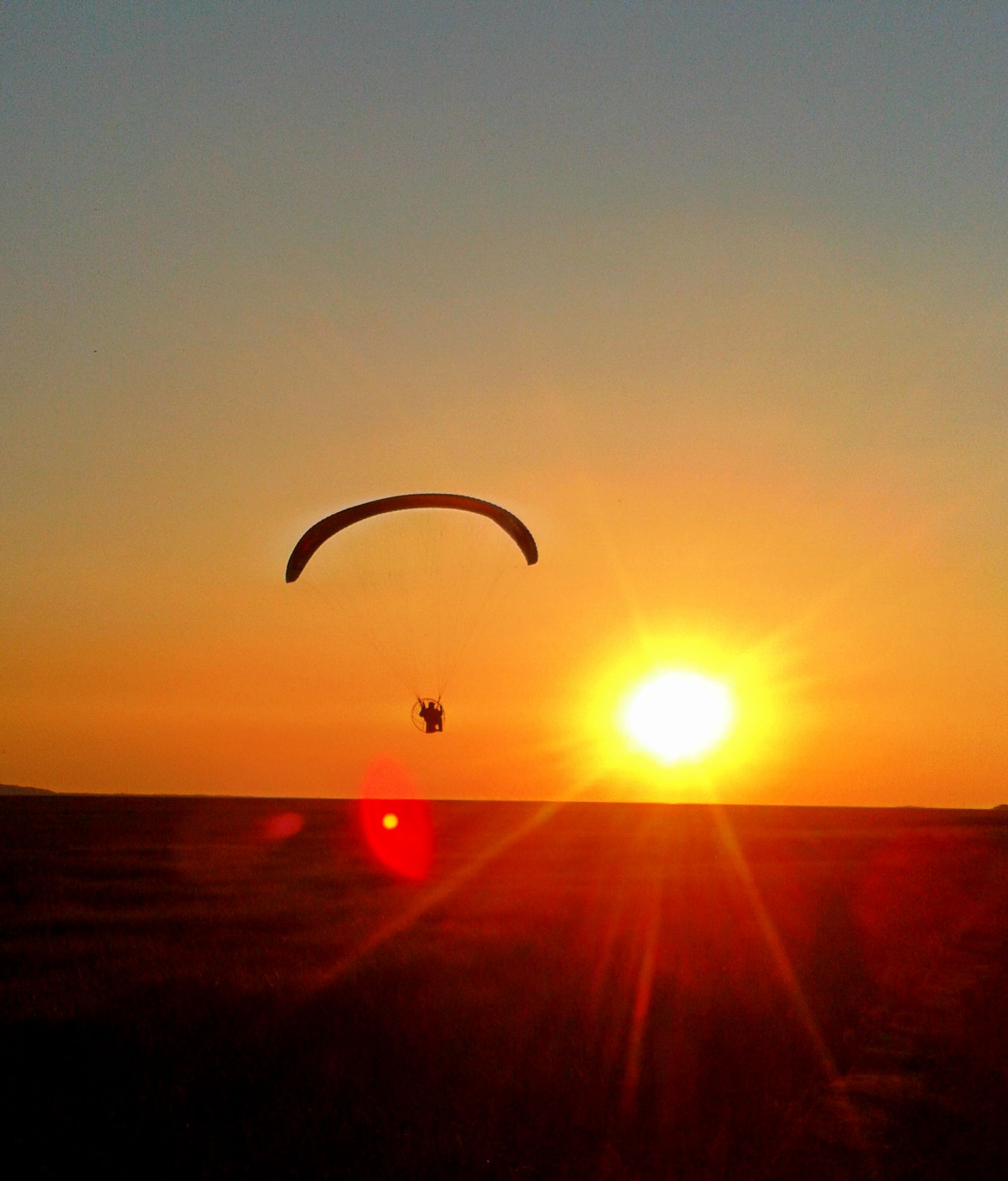 A paraglider soared overhead, silhouetting the arch across the setting sun.